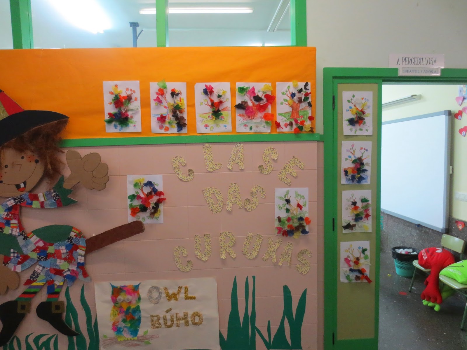 Xa chegou a primavera a clase das curuxas e por iso estivemos facendo flores con diferentes técnicas. Por unha banda empregamos culleres para facer margaritas e, por outra parte, decoramos con papel seda unha árbore que estaba moi triste porque non tiña flores. Este foi o proceso e o resultado: